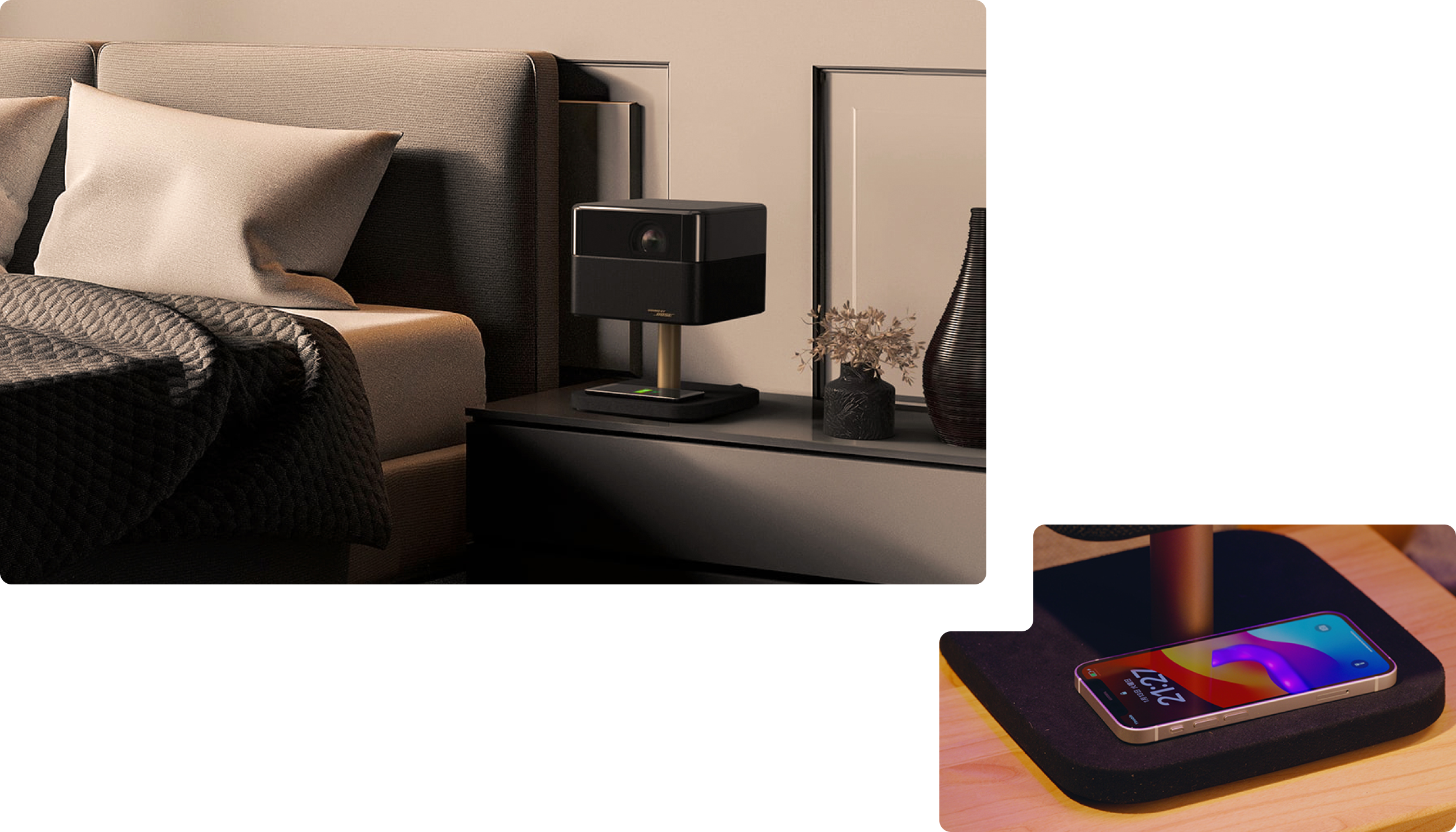 ケーブル類がごちゃごちゃしがちなベッドサイドやリビングルームにうれしい、ワイヤレス充電機能を搭載。動画視聴中もベース部分にQi充電対応スマホを置くだけで充電開始。すっきりした空間が実現できます。