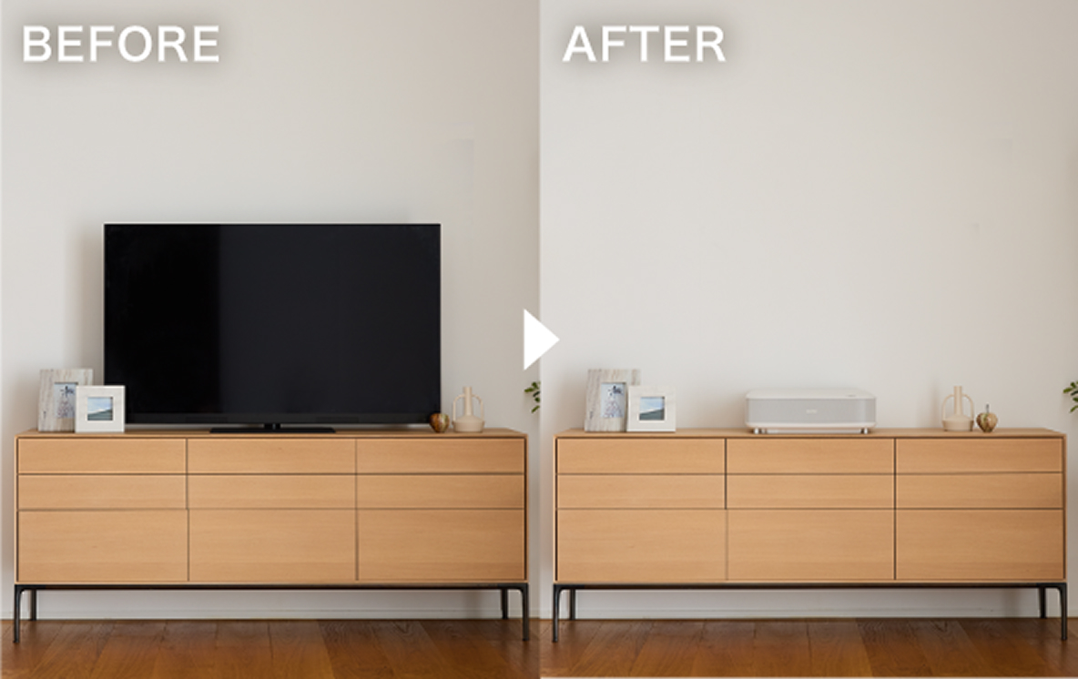 プロジェクターはテレビのように固定画面がないから、使わないときはその分すっきり、インテリアを邪魔しません。これまで手の届きにくかった背面や配線周りもシンプルになり、お掃除もラクラクです。日常の使い勝手までスマートに変えてくれます。