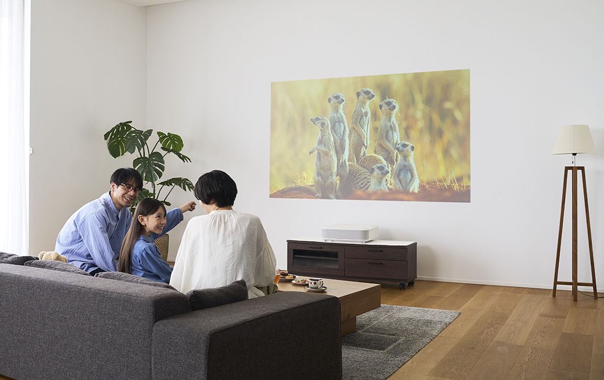 壁から約14cmのところに置けば80インチの大画面を実現できる超短焦点プロジェクター。壁際にすっきり設置できるので、スペースを取らずお部屋のレイアウトも自由に楽しめます。大型テレビでは叶わないような圧倒的なサイズ感の映像を、家族や友人と一緒に迫力満点で楽しめるのが魅力です。さらに、使わないときでも目立ちにくく、生活空間に溶け込むデザインとカラーバリエーションを採用。テレビを置かないミニマルで広々としたリビングづくりを目指す方にもぴったりです。リビングの主役を、テレビからプロジェクターへ――そんな新しいスタイルを提案します。