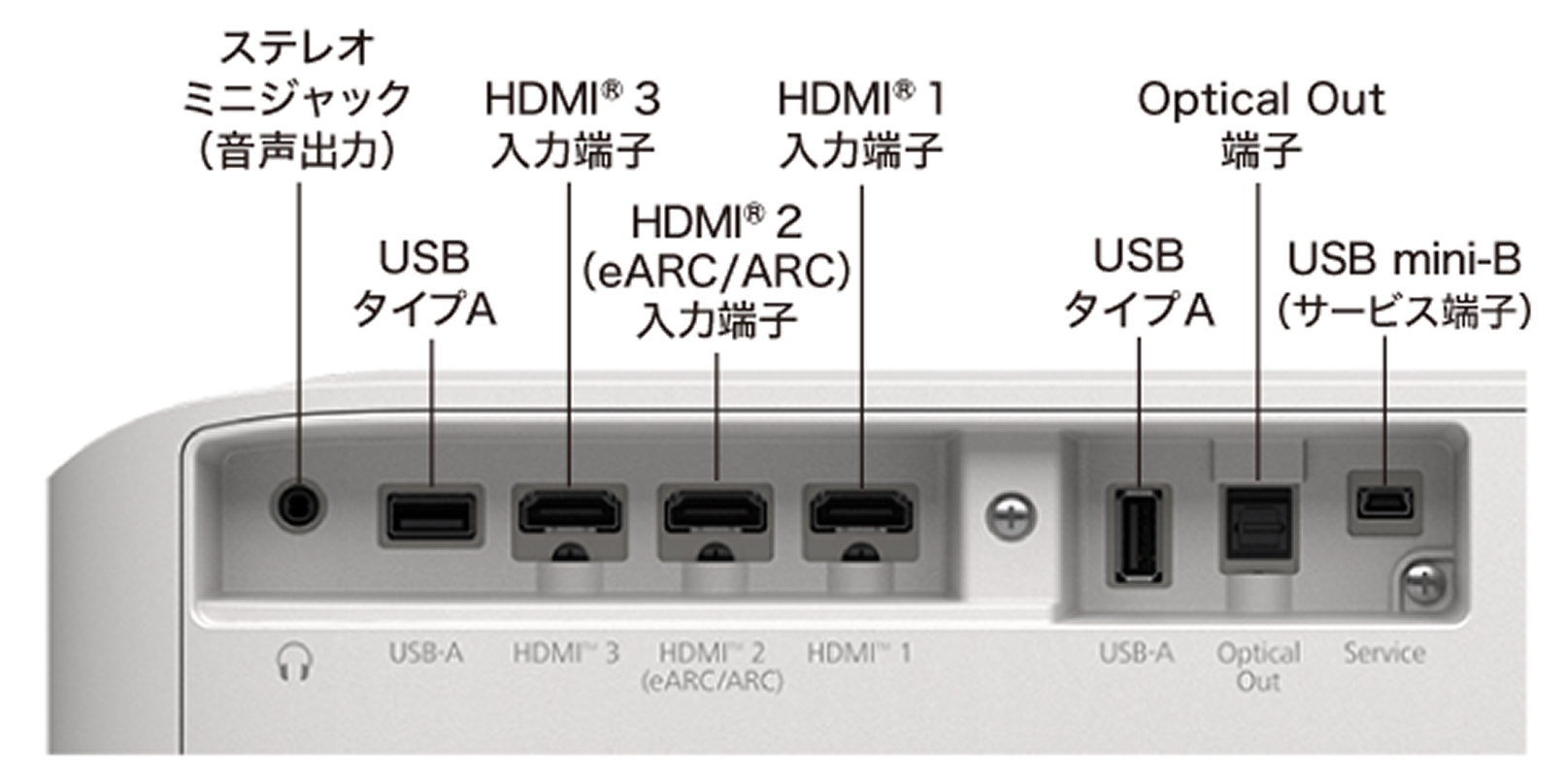 HDMI® 1端子 1系統 HDMI® 、HDMI® 2(eARC/ARC)端子 1系統 HDMI® HDMI® 3端子 1系統 HDMI® 、USB-A端子 2系統 USBコネクター(Aタイプ) Service端子 1系統USBコネクター(Mini-B)、Audio Out端子 1系統 ステレオミニピンジャック Optical Out端子 1系統 光デジタル音声コネクター(S/PDIF) |
