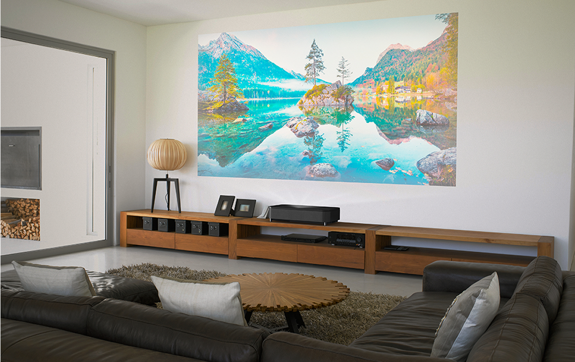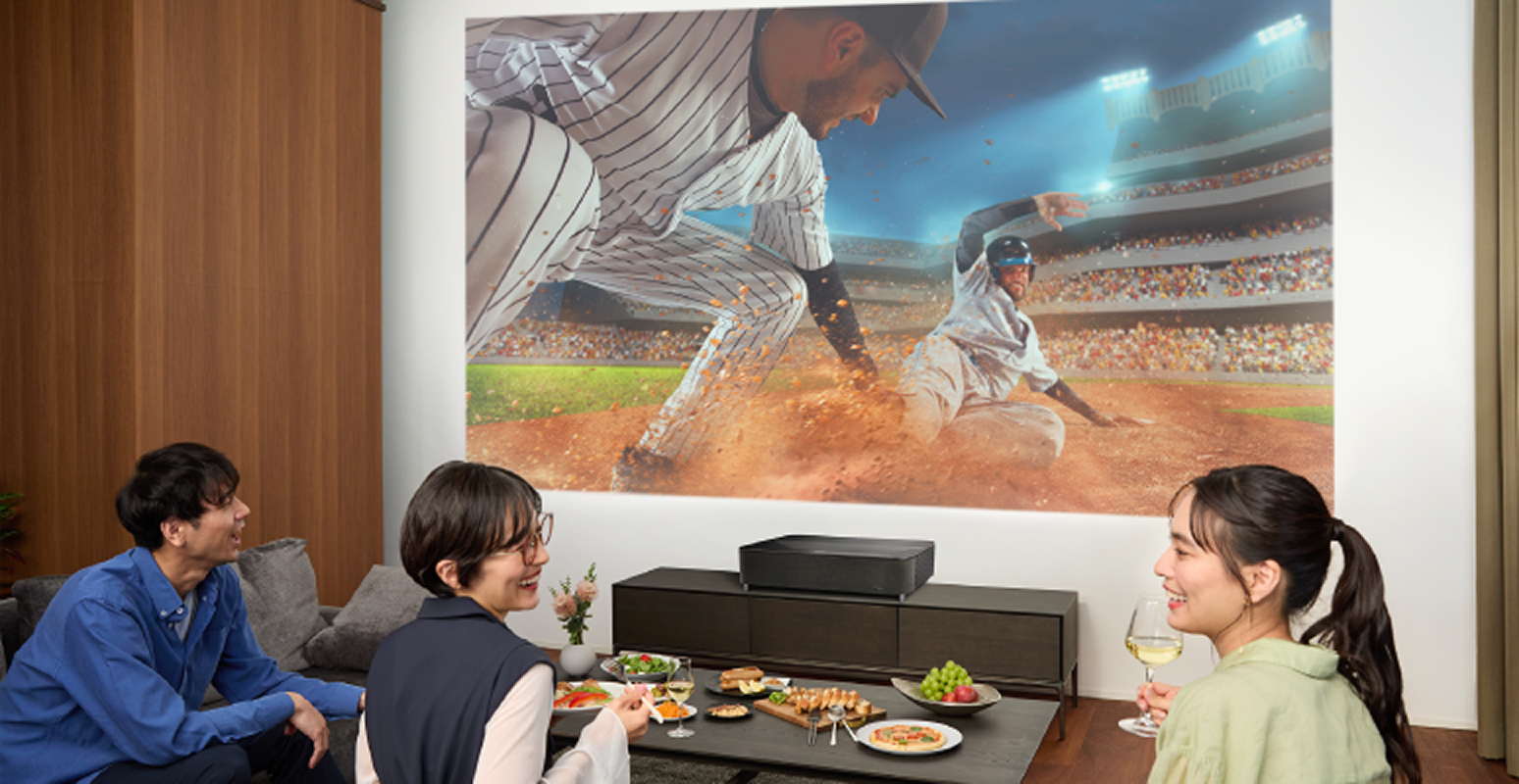 壁から17.5cmのところに置けば120インチ(2.7×1.5m)の大画面を実現できる超短焦点プロジェクター。4000lmの明るさで、明るいリビングでも高品質映像が楽しめます。家族とのリラックスタイムや、友人を招いてのホームパーティーなど、日常のひとときを特別な時間へと変えてくれます。プロジェクターを起動するだけで、リビングがまるでミニシアターのように早変わり。日常のシーンを、記憶に残るかけがえのない時間に変えられます。