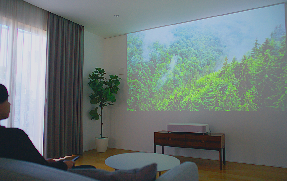 プロジェクターはテレビのように固定画面がないから、使わないときはその分スッキリ、インテリアを邪魔しません。プロジェクターを使わない時も、インテリアに馴染むデザインなので広々とした自室が手に入ります。さらに超短焦点プロジェクターだから、壁際に置くだけで100~150型の大画面を実現。テレビでは味わえないサイズ感と没入感をご自宅で楽しめます。