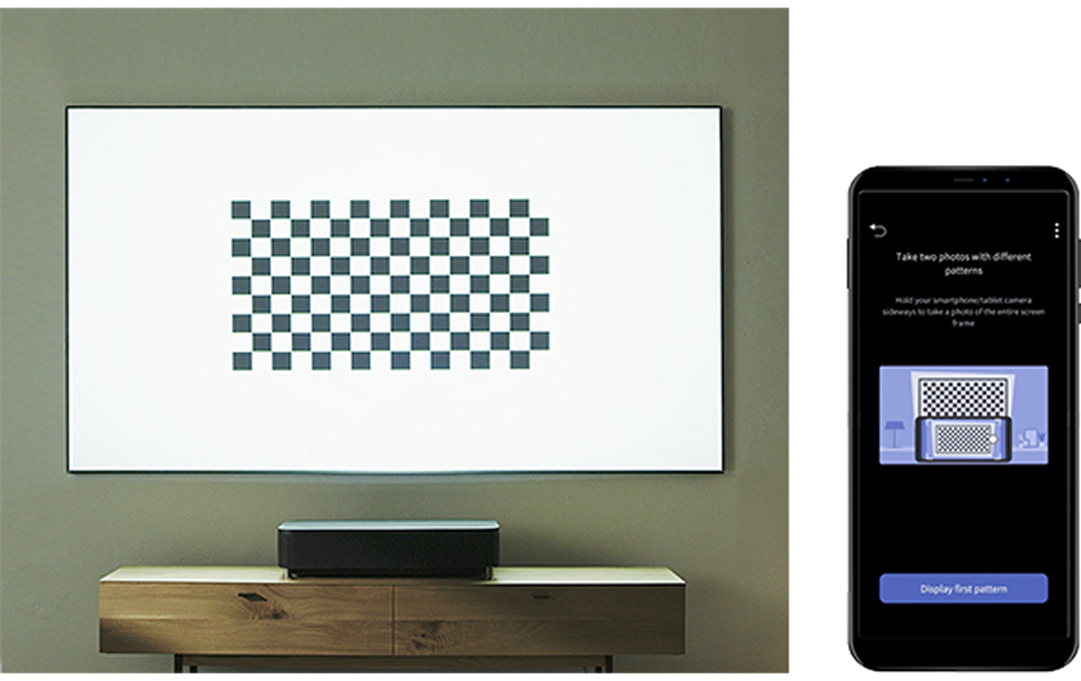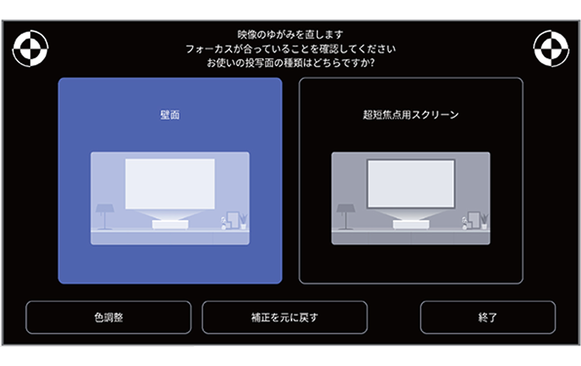 映像の歪み補正は、画面の指示に従ってリモコンで操作するだけで補正できます。また、スマートフォンで補正することもできます。