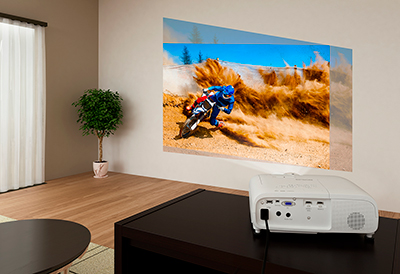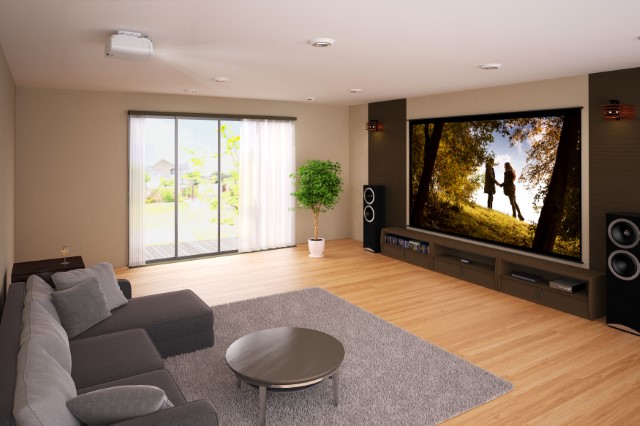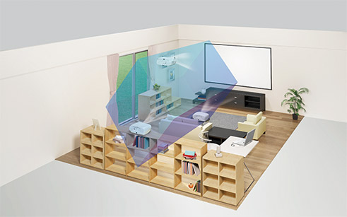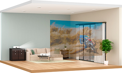 6畳間(3.6m×2.7m)程度のスペースでも80型や100型の大画面投写が可能です。