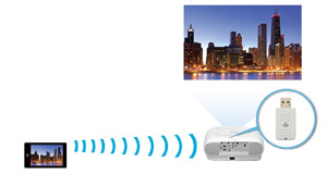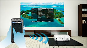 EH-TW7100はオプションの無線LANユニットを使って、無線LAN経由のデータ送信が可能です。また、Epson iProjectionを使ってスマートフォンやタブレットをプロジェクターのリモコンとして使うことができます。