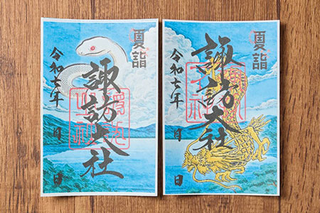 諏訪明神伝説や季節の風物詩をモチーフにした御朱印を頒布