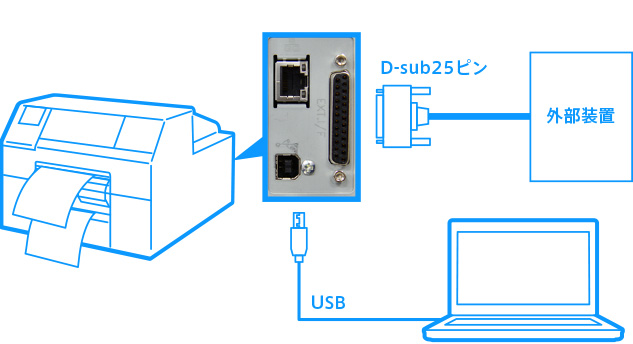 印刷開始/入力/一時停止/再印刷/印刷終了など、プリンターを制御する信号をやりとりするD-sub25ピンの外部インターフェイスを搭載。PLCなど外部の制御装置からでもプリンターを管理でき、製造現場の自動化ラインなどにも組み込んでご使用いただけます。