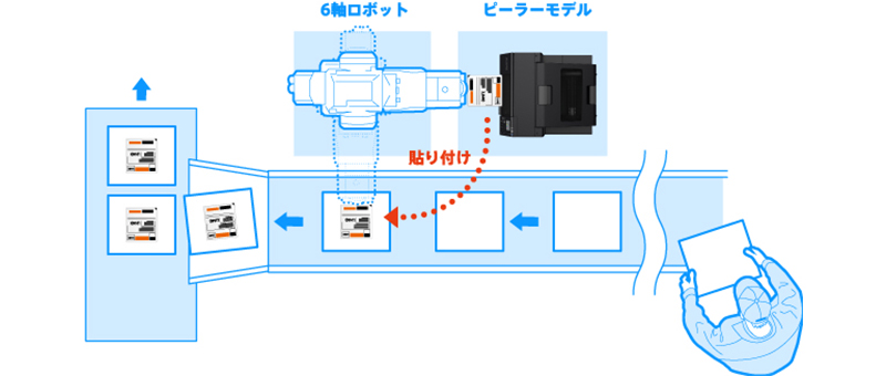 中小ジョブや、ロボットでの自動貼りが難しい形状など、手貼り工程で活用するシーンにおいても、ラベルの貼り付け作業の即時性を向上させます。ラベルを台紙から剥がす手間がなくなるので、オペレーター業務の軽減します。また、1枚ずつラベルが順番に発行されるので、貼り間違いなどのミス軽減もサポートします。