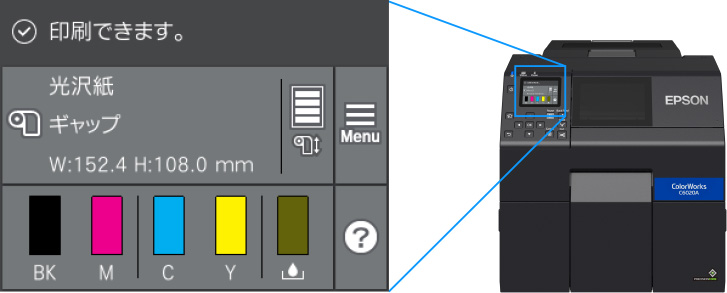 本体に2.7型カラーLCDモニターを搭載。各色インクカートリッジの容量やメンテナンスボックスの使用量、ロール紙の残量など、プリンターに装着されている消耗品の状態を本体で確認できます。また、ラベル検知の方法(ギャップ・ブラックマーク)やIPアドレスなどのプリンター設定もパネル操作で実施できます。ラベル用紙の種類や検知方法が一目でわかるので、設定間違いを防ぎ、用紙や時間のロスを低減します。