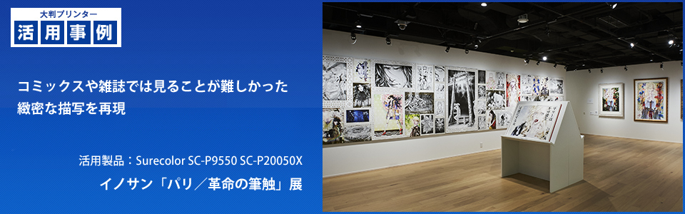 2019年11月16日~12月11日に「エプソンスクエア丸の内 エプサイトギャラリー」にて、以前より協力関係のある集英社さまの依頼により、漫画家・坂本眞一さんの代表作『イノサン』『イノサン Rougeルージュ』の大判プリント&大型本の展覧会が開催。11色の新インクセット「UltraChrome PRO12」採用の高画質大判プリンター「SureColor SC-P9550」によるプリントで見えてくる絵の繊細さに、多くの来場者が感嘆の声をあげていた。