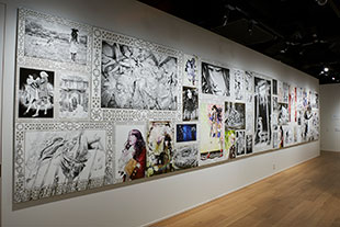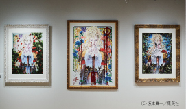 特別サイズの「ベルベット調ファインアート紙」で多くの作品を出力し、壁一面に配置。さまざまなシーンの描写をじっくりと鑑賞できた。