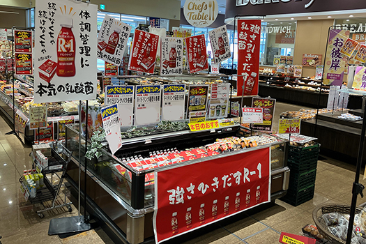 刺身や精肉の「赤」が際立つ販促物で売場での視認性がアップ
