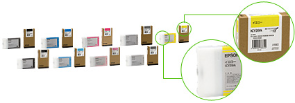 大判インクジェットプリンターのインクカートリッジ個装箱は、機種、色、発売国の仕様などで何種類も用意していましたが、2006年12月出荷分から世界共通タイプに統一。再生紙の茶箱にモノクロ印刷をし、7カ国語を併記しているのが特長です。また、インクカートリッジは、これまでグレーに着色していたものをナチュラルカラー化して添加する着色剤をなくしました。製造時の成型工程エネルギー使用料削減によりCO2排出量を約50%削減し、また汎用性が増して材料のリサイクル性向上が見込めます。
