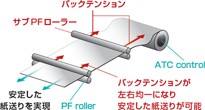 用紙経路にサブローラーを搭載。用紙の左右にかかるバックテンションを均一に保ち、安定した紙送りを実現します。