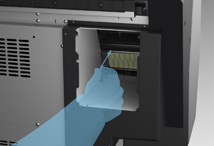 画質の劣化につながるメディアの紙粉や毛羽のクリーニングを容易に。都度サービスエンジニアを呼ぶ必要がないので、プリントの中断時間を短縮できます。