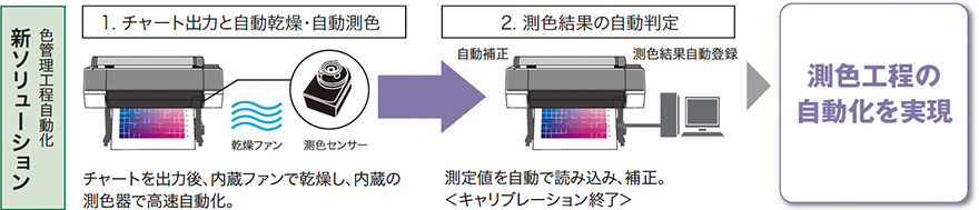対応のソフトウェアRIPを使用することでオプションの自動測色器ILS30EPの装着が可能。日常の色管理工程(キャリブレーション)の省力化はもちろん、測定カラーチャートを測色することで色認証にも対応可能です。またILS30EPは従来機(ILS20EP/ILS20EPUV)との測色スループット比で最大約2倍、測色パフォーマンスが向上しています。