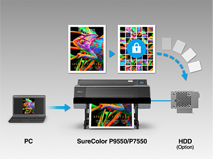 オプションのHDD(320GB)の装着により、HDDに保存されたジョブをプリンターから直接印刷可能です。データはプリンターに送信されると自動的に暗号化されます。他のプリンターやPCではデータを読み取ることができない為、安心してご使用いただけます。