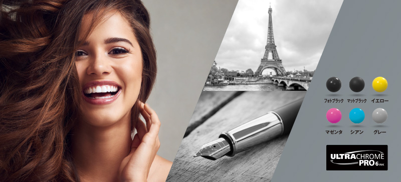 エプソンの純正インク「UltraChrome PRO 6インク」は全色顔料インク。水濡れや色あせに強く、ポスター用途に安心してお使いいただけます。