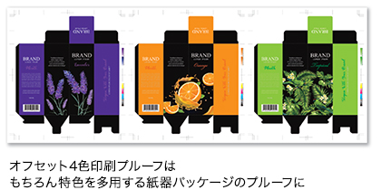 多品種小ロット化が進む紙器パッケージの制作において、印刷本機または平台校正機で行われていた紙器パッケージの色校正(プルーフ)作業を大判インクジェットプリンターでデジタル化することで、大幅なコストダウンと短納期化を実現します。