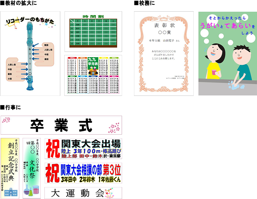 学校掲示物や教材に使える素材が満載のテンプレートに横断幕などの長尺印刷が可能なソフトを標準添付。クロスメディアを使用した横断幕などの印刷の用途にも使えます。