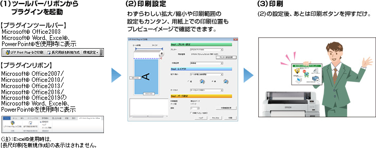 | (注)「LFP Print Plug-In for Office」、「最新のプリンタードライバー」のダウンロードおよびインストールが必要です。 |