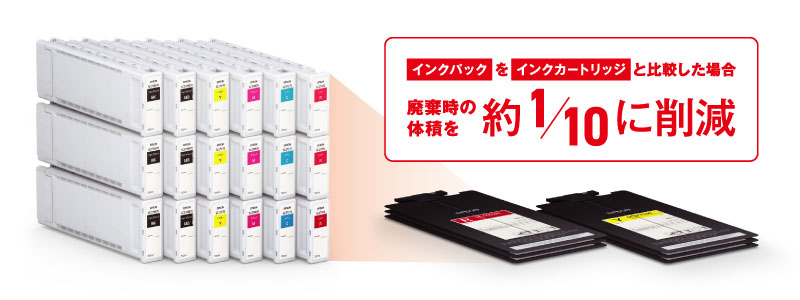 従来のインクカートリッジと比較し廃棄時の体積が約1/10となる為、廃棄時の取り扱いが楽になります。