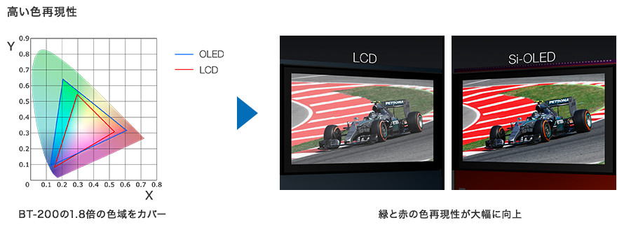 シリコンOLED(有機EL)の高輝度・高コントラストにより、現実の視野とMOVERIOの映像の境目が見えない、美しい映像表現が可能。