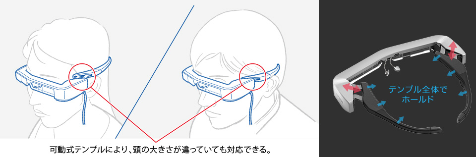 子供から大人まで、幅広いサイズに対応できる、可動式テンプル構造。