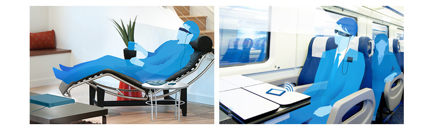 モベリオは、楽しむ環境を選びません。映像や情報を、部屋の中だけでなく、屋外、列車内や機内、宿泊先などあらゆる場所で見ることができます。しかも、座っても寝転がっても、画面は常に目の前。あなたが一番楽な姿勢で鑑賞できます。