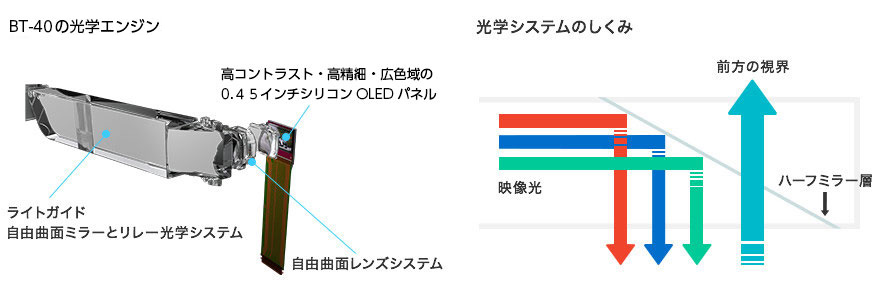 周りの状況を視認しつつ、映像も楽しむことができるシースルースタイル。ヘッドセット部には、0.45型のシリコンOLED(有機EL)を採用。左右の側部に光学系を内蔵し、投写映像をプリズムで反射させ、前面のハーフミラー層に24bitカラー(約1,677万色)の映像を映し出します。