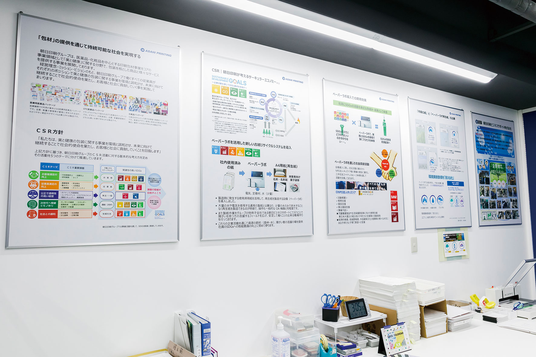 富山工場の機械展示室内に専用ルームを作り、そこで運用を行っています。ルーム内には、朝日印刷のCSRへの取組みや朝日印刷ビジネスサポートの業務を紹介するパネルや、エプソンさんからいただいた実績報告書をもとに環境貢献度が分かるパネルを作成して展示コーナーとしても機能させています。