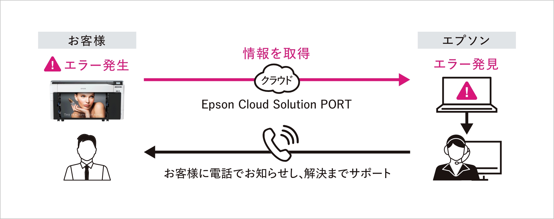 さらに、エラーお知らせサービス対象機種であればエプソンから直接電話でエラーをお知らせし、エラーの対処法案内や必要に応じて修理の手配なども行い、解決までサポートします。