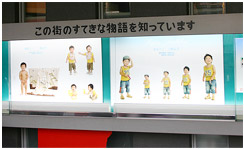 「この街のすてきな物語を知っています」こんなキャッチフレーズを掲げたショーウィンドウが写真館の入口に作られています。ここではモデルとなっているお子様一人に焦点を当てて構成された、ストーリー性のあるパネル写真が展示してあります。