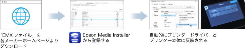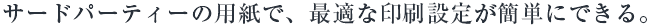 サードパーティーの用紙メーカー・ブランドがホームページで配布している「EMXファイル(注1)」をダウンロードし、Epson Media Installerから登録することで、ICCプロファイルだけでなく、用紙厚やプラテンギャップなどのプリント設定情報もプリンタードライバーとプリンター本体に自動的に登録することが可能です。