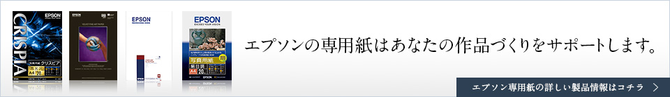 エプソンの顔料インクは、用紙表面にインク粒子がしっかり定着するため、幅広い質感の用紙に美しくプリントできます。印画紙タイプの「写真用紙」はもちろん、光沢感と透明感あふれる表現が可能な「写真用紙クリスピア<高光沢>」、また写真を絵画のように表現できる画材用紙や、光沢のない落ち着きのあるソフトな質感のマット紙、品のよいテクスチャーを施した「Velvet Fine Art Paper」など幅広くご用意。写真に紙選びの要素を加えることで、作品の幅が広がります。