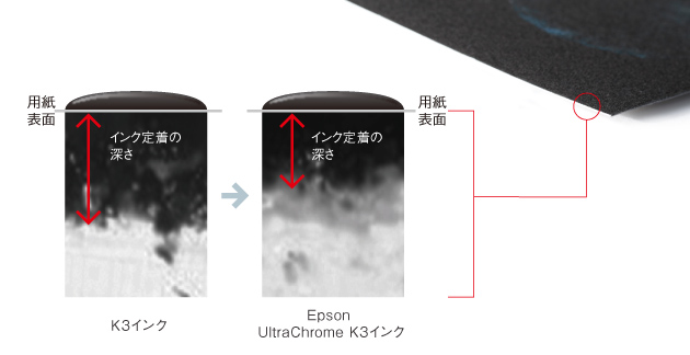 ファインアート系の用紙で、より深い黒を再現するマットブラック。SC-PX3V、SC-PX5VIIに搭載された、「Epson UltraChrome K3インク」は、従来のK3インクよりも用紙の表面付近に定着しやすくなり、重厚感のある「黒」とともに、シャープな再現が可能となりました。しかも、エプソン純正用紙はもちろん、幅広いファインアート系用紙でその優れた定着性を発揮。作品の狙いに合わせて最適な用紙を選ぶことで、表現の自由度が広がります。