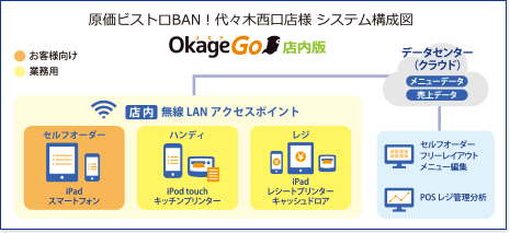 「「Okage Go 店内版」にすることで、必要機器は主にiPadやiPod、レシートプリンターだけになり、専用端末を使ったオーダーエントリーシステムのセットに比べて、システム開発以外の初期導入コストが約1/10に削減できました。店員側は、iPadまたはiPodでも注文・会計端末としての利用が可能で、故障など緊急時対応も安心です。また、機器類も小型で省スペースなので、設計時にレジスペースを縮小することで、新店舗では店内席数を増やすこともできそうです。」