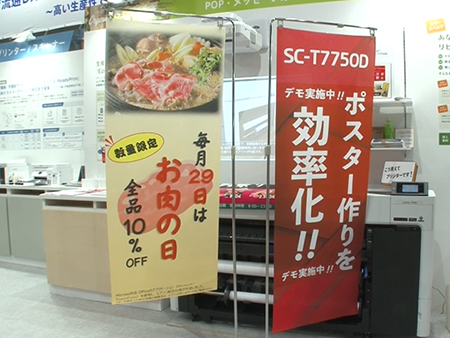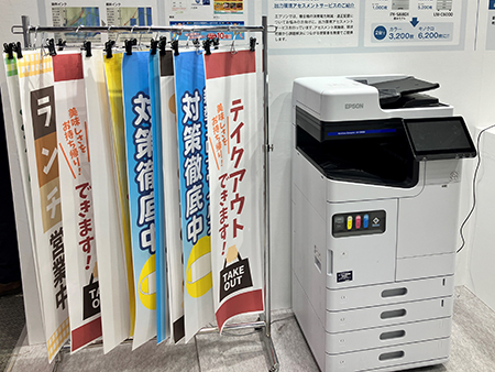 エプソンブースではカラーラベルプリンター、POPやポスター印刷におススメの大判カラープリンター、バックヤードでご利用いただけるビジネスインクジェットプリンターのラインアップを展示しました。
