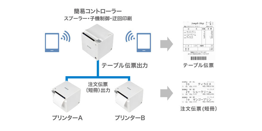 TM-m30Ⅱ-Hは各種Web連携機能を備え、コントローラーとしての機能を果たすことが可能となりました。タブレットPOSのレシート印刷だけでなく、店舗内のプリンターコントローラーとしてキッチンプリンターなどを制御することも可能です。