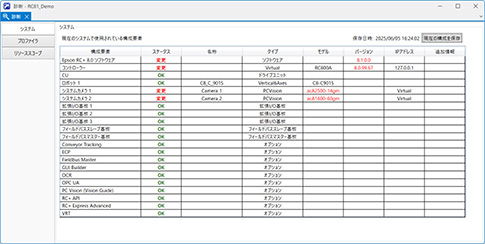 現在のロボットシステムを構成するソフトウェアとハードウェアを一覧表示できます。