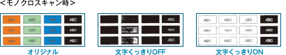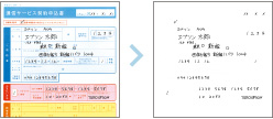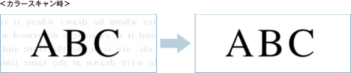 文字の背景に色が付いているような原稿(帳票)などをモノクロでスキャンするとき、文字部分のみを抽出して読み取りできるので、文字が濃色の背景と同化してしまうことを防ぎ、文字の可読性を大幅に向上させます。また、単純2値読み取りだと潰れてしまいがちな細い文字(線)と太い文字(線)の同時読み取りでも、くっきり読み取れます。カラースキャン時には原稿の裏写りを低減し、文字の可読性を向上させます