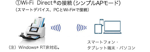 無線ルーターがなくても、Wi-Fi Direct®の接続でPCやスマートフォン、タブレット端末と1対1でダイレクトに接続可能。使用場所の自由度が大きく広がります。また、スマートデバイス対応アプリ「Epson Smart Panel」使用時には、自動的に無線ルーターを検知してインフラストラクチャーモードで優先的に接続します。