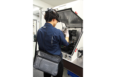 作業手順を確認しつつ、分析装置にサンプルをセットする様子。