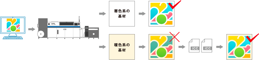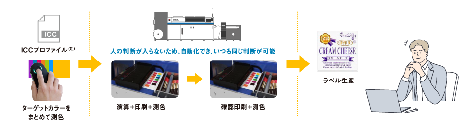 従来のような煩雑な手順(印刷したチャートをカットシートに切り出し→測色テーブルにセットし測色→専用ソフトでICCプロファイル生成)が一切不要で、特殊なスキルや経験を必要とする事なくICCプロファイルを作成。さらに外部で作成されたICCプロファイルをインポートして使用する事もできますので、他のデジタル印刷機との連携も可能です。