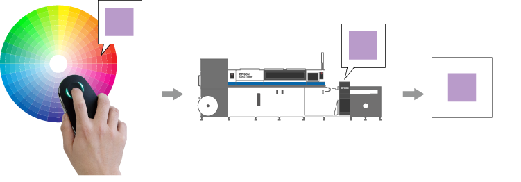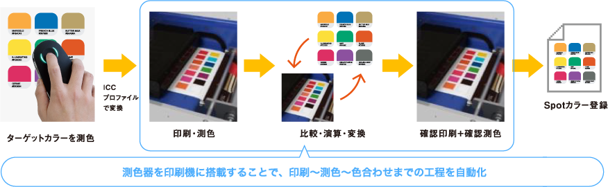 SurePressに測色器をインラインで搭載し、色合わせを行えます。測色器を印刷機に搭載することで、印刷→測色→色合わせまでの工程を自動化。特別な知識を必要とせず、色調整を行えます。印刷物そのままをチェックするので、基材に応じたICCプロファイルを簡単・短時間で作成可能です。