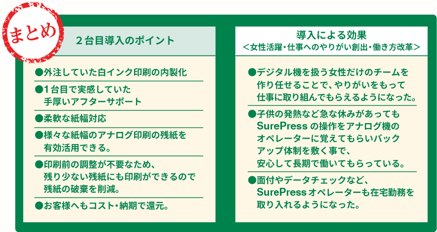 使い慣れており、印刷のクオリティの高さや紙幅が自由に決められるという基本性能も自社の仕事に向いていました。アフターサービスにも満足していましたし、最終的にSurePressの白インク搭載モデルに決めました。さらに、デジタル機の特徴を活かすため、SSラボという部署を立ち上げ、デジタルオンリーでジョブを完結しています。