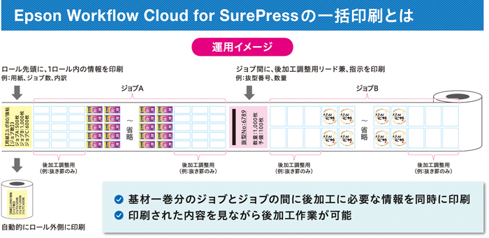 加工工程に必要な情報をSurePressが自動挿入するため、刃型違いの複数ジョブも連続印刷が可能。
