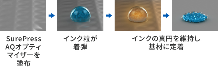 カラーインク印刷部分の下地として新開発のSurePress AQ オプティマイザーを基材表面に塗工することで、インクが着弾した瞬間に高速でドット形状を固定し、基材上でのインクの流動や滲みを抑制します。これによりSurePress独自の高画質と高速印刷の両立が可能。
