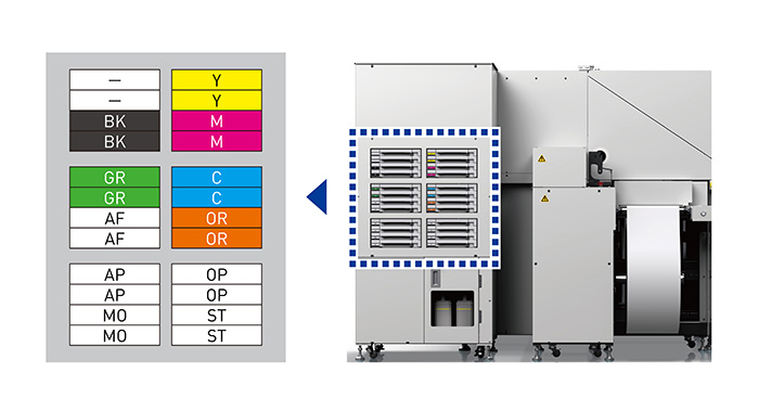 CMYKに加え従来機種と同様オレンジ、グリーンインクの搭載により広い色域を実現し高い色再現性を発揮します。