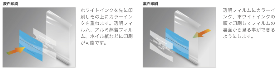 高い光沢度を誇る白インクをシングルパスで印刷することで、透明基材やメタリック基材に対してカラー印刷を行うための理想的なベースとなるホワイト層を提供します。もちろん白文字や白線も高い濃度で再現可能です。尚、ホワイト印刷の順序は用途に応じて2通りから選択可能。透明/不透明の基材どちらにも対応します。裏白印刷の場合、印刷物を巻き戻す、もしくはロールを差し替える必要があります。